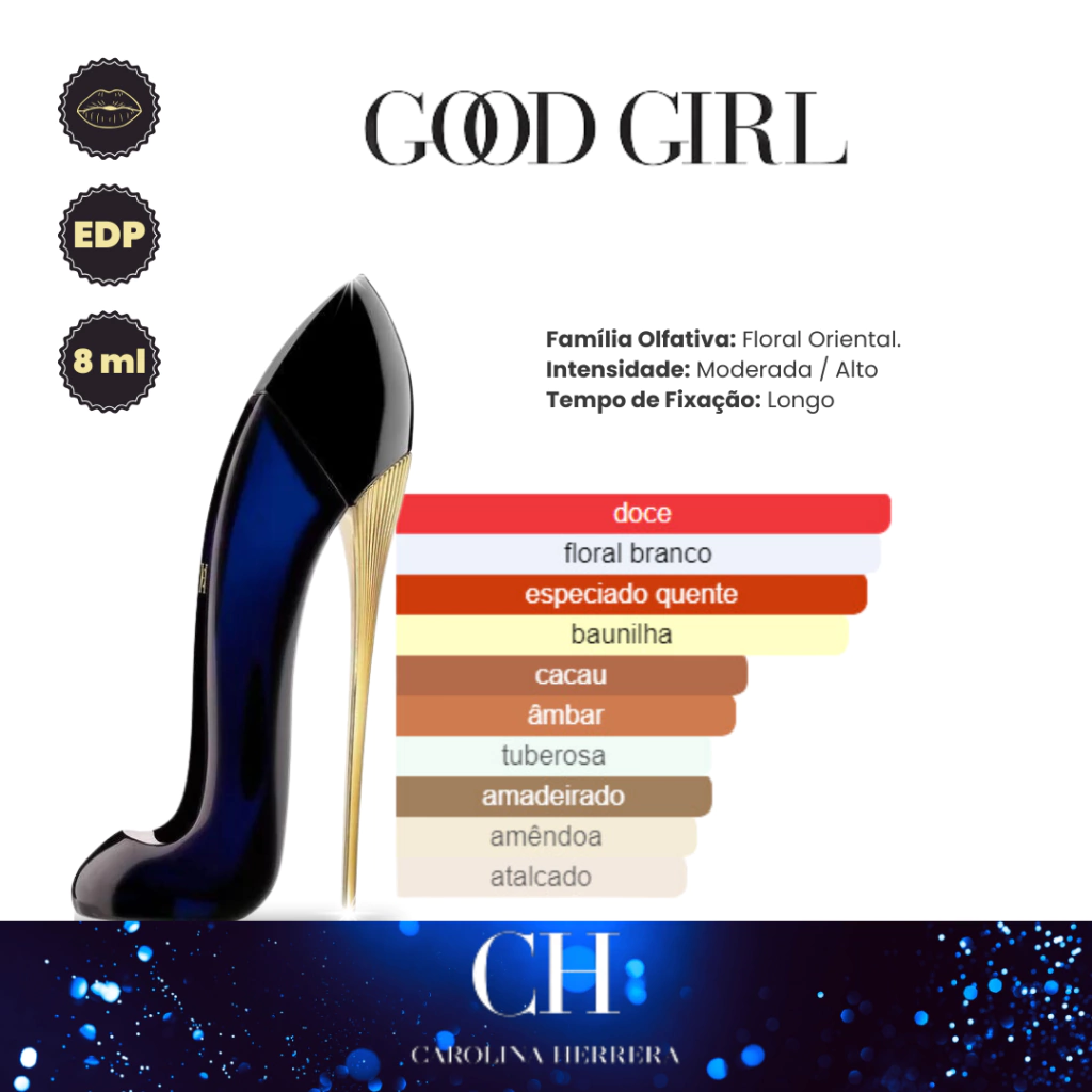 Seguindo, temos Good Girl da Carolina Herrera (EDP), um perfume intrigante e cativante, que encarna a dualidade da mulher moderna. Com notas de amêndoa, café, jasmim sambac, tuberosa, tonka e cacau, o Good Girl é simultaneamente fresco, doce e misterioso. Ele é perfeito para a mulher que brilha com sua própria luz e que desafia as expectativas.